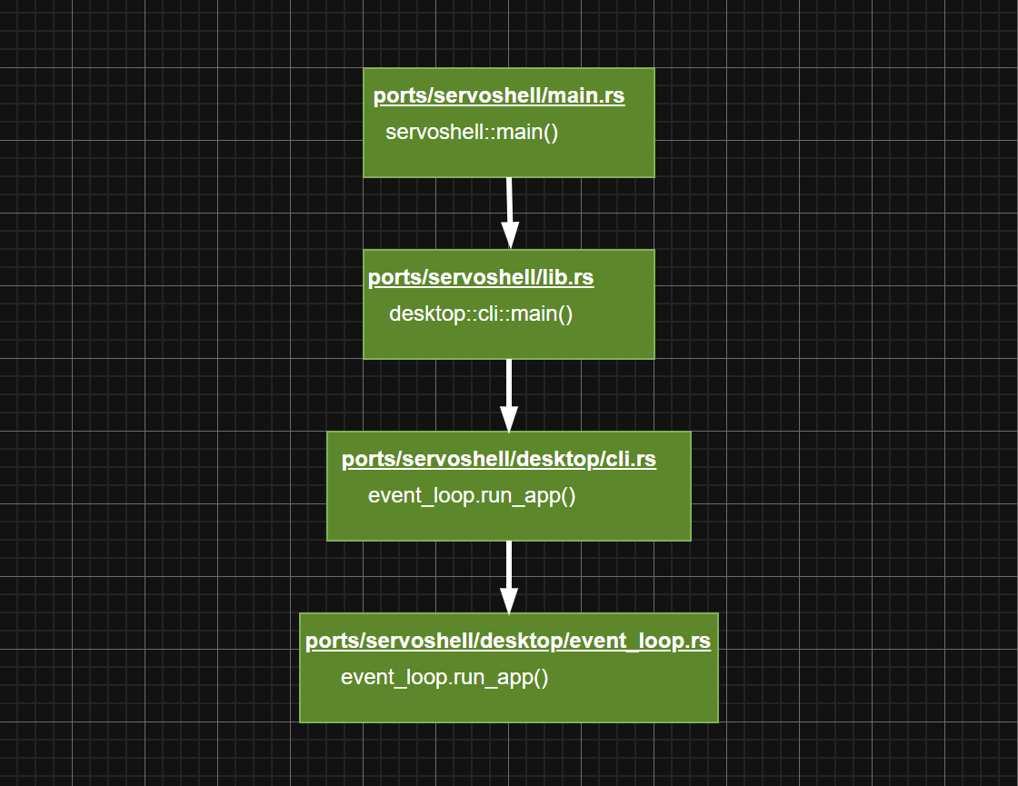 For Windows, the entry point is ports/servoshell/main.rs, where we’ll run the function servoshell::main(), which is just a wrapper to desktop::cli::main().
